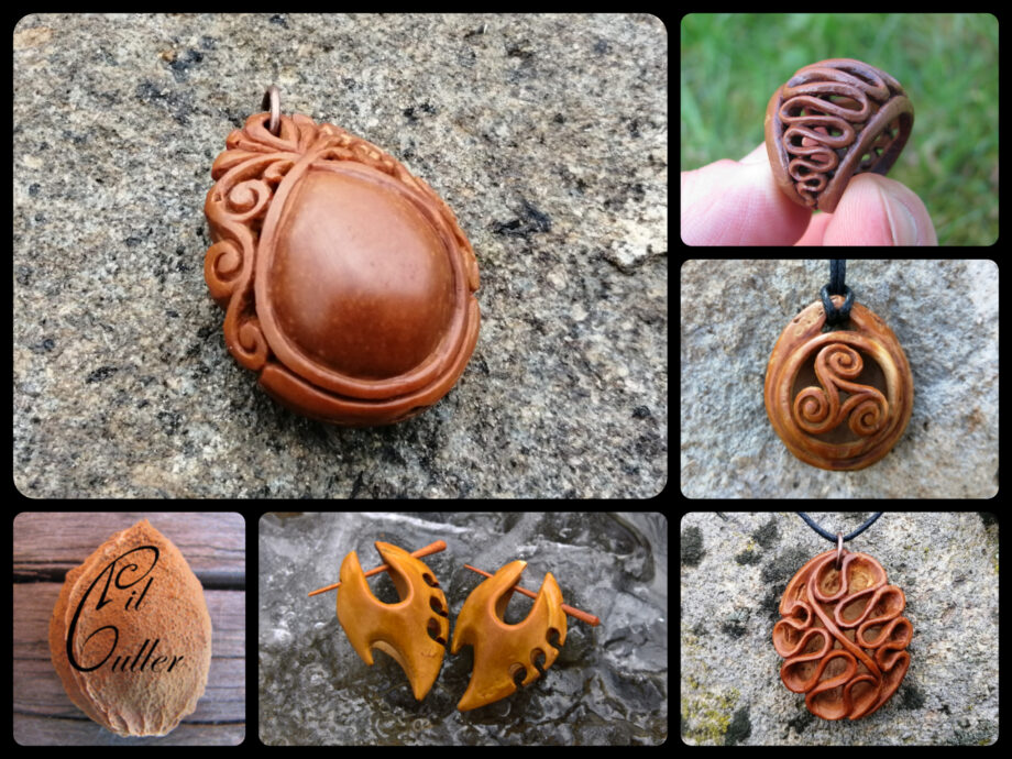 Gyümölcsmagból faragott egyedi ékszerek, miniatűr faragványok.